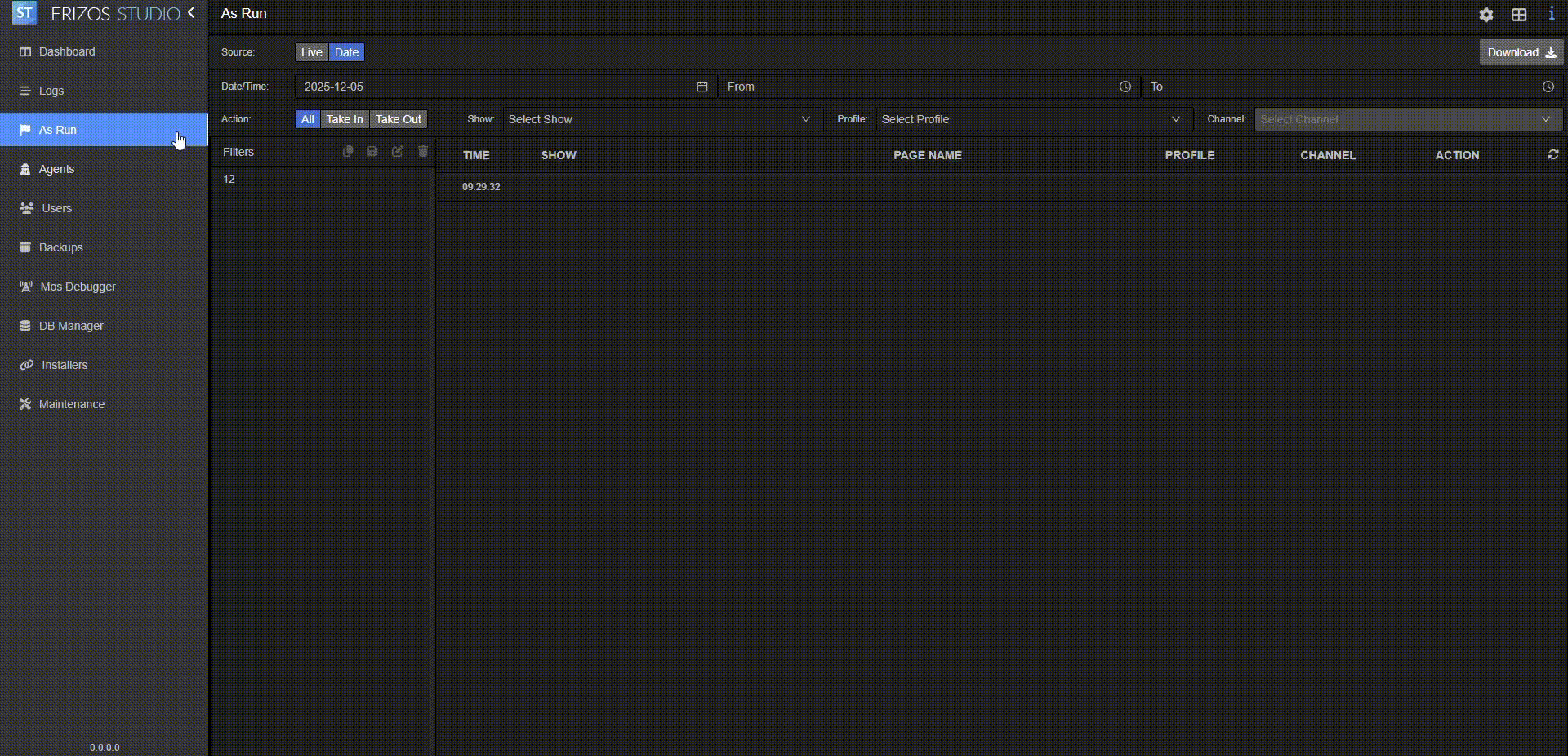 The AsRun feature provides users with a detailed log of broadcast events, allowing you to track aired content after transmission. It captures key broadcast data such as timestamps, page names, profiles, channels, and actions performed. This feature is essential for post-broadcast verification, compliance audits, reporting, and event analysis.