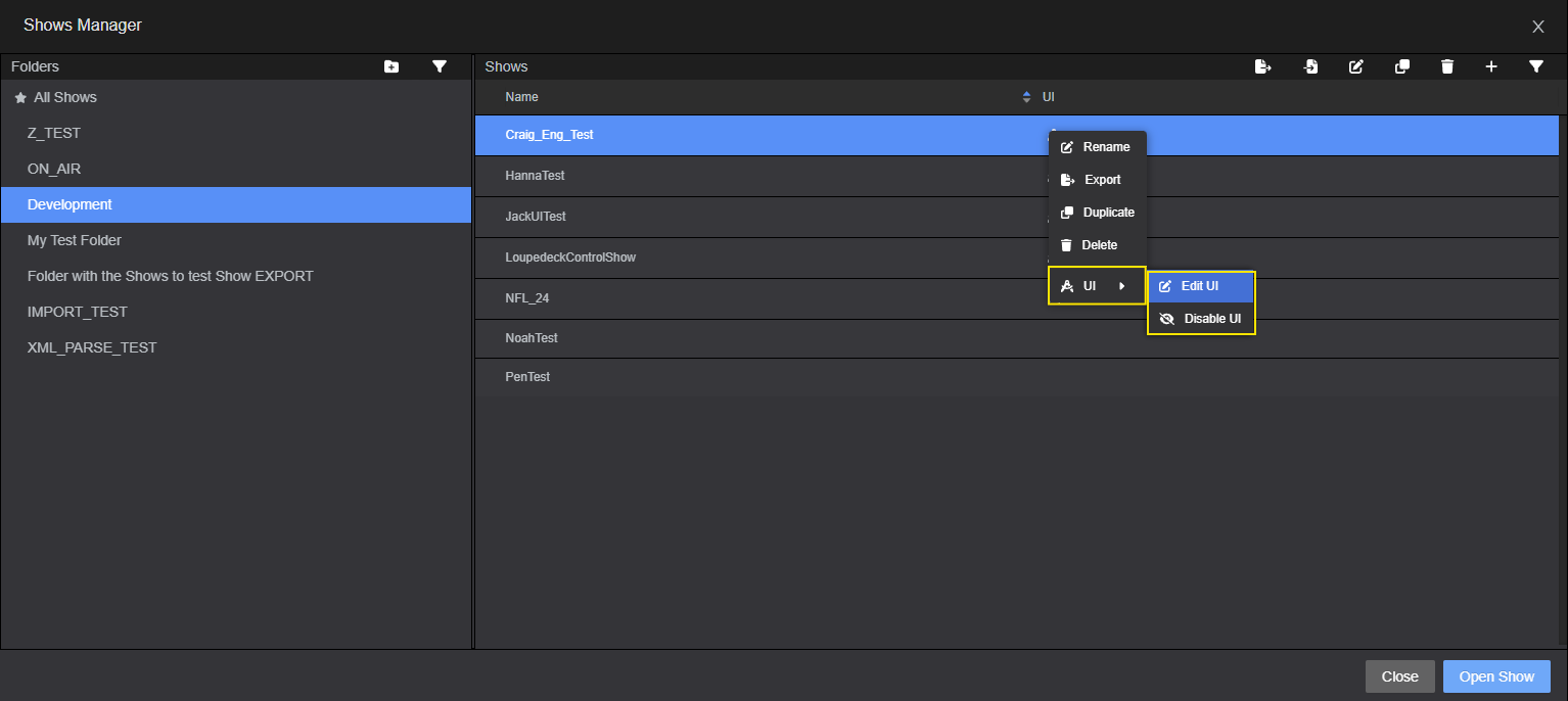 In the Shows Manager you can now quickly manage the UI associated with a Show using the right-click context menu.